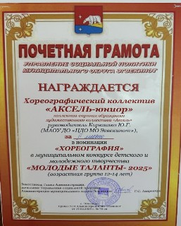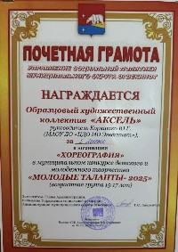 В 2014 году хореографическому коллективу «Аксель» было присвоено звание «Образцовый художественный коллектив», а в 2017 и в 2020 году коллектив «Аксель» подтвердил звание вновь.
