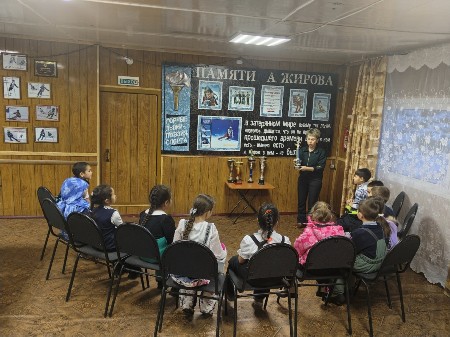 В беседе приняли участие 13 горнолыжниковиз группы первого года обучения. Детей познакомили с историческим прошлым горнолыжной базы,систориейспортивных успеховАлександра Жирова, с его знаменитыми победами на Кубках мира, а также рассказали о трагической гибелив самом расцвете спортивной карьеры. Дети узнали историю организации в 1986 году традиционных соревнованийнаКубок А.Жирова, которые ежегодно проходят в п. Эгвекинот. В беседе были использованы различные фотоматериалы, а такженаграды и кубки, которые были вручены победителям и призерам соревнований на Кубок А.Жирова прошлых лет.