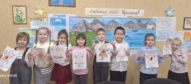 В честь 95-летия образования Чукотского автономного округа для учащихся 1 класса прошло занятие «Народы Севера земли», направленное на воспитание патриотизма, толерантности и культуры общения через знакомство с традициями и обычаями северных народов. Ребята познакомились с традициями коренного населения, особенностями быта и жизнью в условиях Крайнего Севера. Также они узнали о видах национальной одежды, основных узорах и орнаментах. В качестве практического творческого задания дети выполнили эскиз женской национальной одежды — кухлянки — с использованием геометрических орнаментов.
